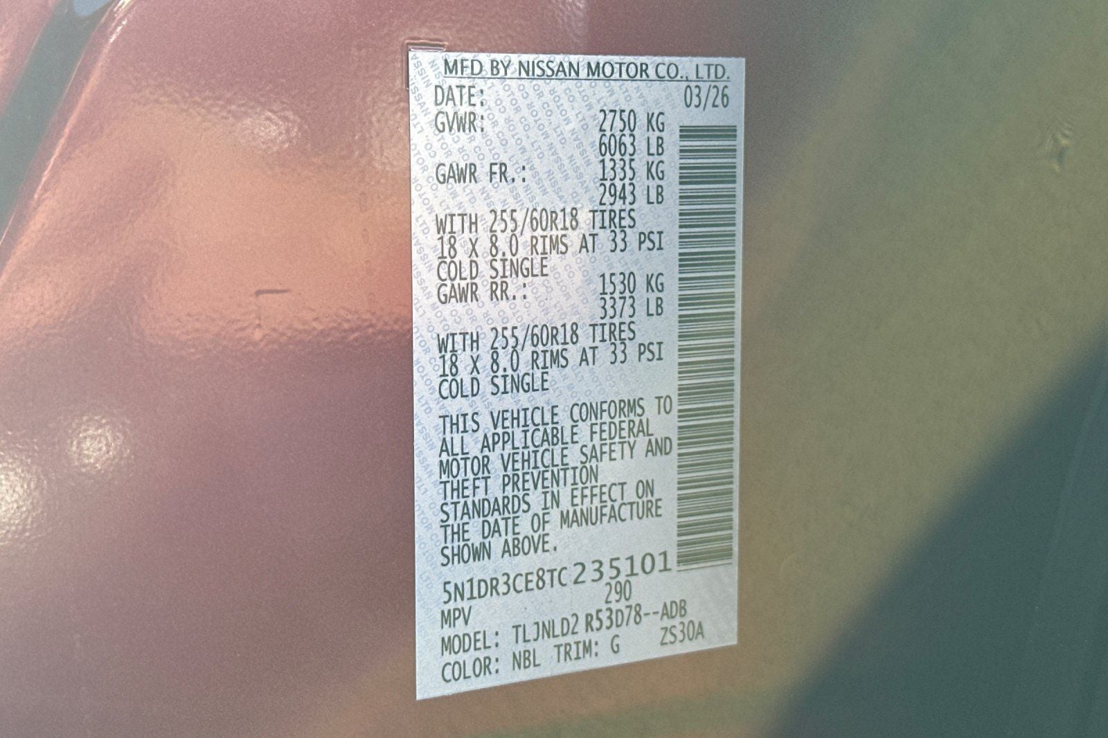 4WD, 18 Machined Alloy Wheels, 3rd row seats: bench, 4-Piece Black Splash Guards, 4-Wheel Disc Brakes, 6 Speakers, ABS brakes, Air Conditioning, Alloy wheels, AM/FM radio: SiriusXM w/360L, Auto High-beam Headlights, Auto-dimming Rear-View mirror, Automatic temperature control, Bench Seat Carpeted Floor Mats, Brake assist, Bumpers: body-color, Delay-off headlights, Driver door bin, Driver vanity mirror, Dual front impact airbags, Dual front side impact airbags, Electronic Stability Control, Emergency communication system: NissanConnect Services, Four wheel independent suspension, Front anti-roll bar, Front Bucket Seats, Front Center Armrest, Front dual zone A/C, Front reading lights, Fully automatic headlights, Garage door transmitter: HomeLink, Heated door mirrors, Heated Front Bucket Seats, Heated front seats, Heated steering wheel, Illuminated entry, Knee airbag, Low tire pressure warning, NissanConnect featuring Apple CarPlay and Android Auto, Occupant sensing airbag, Outside temperature display, Overhead airbag, Overhead console, Panic alarm, Passenger door bin, Passenger vanity mirror, Power door mirrors, Power driver seat, Power Liftgate, Power steering, Power windows, Premium Paint, Radio data system, Radio: AM/FM Audio System with NissanConnect, Rear air conditioning, Rear anti-roll bar, Rear reading lights, Rear seat center armrest, Rear side impact airbag, Rear window defroster, Rear window wiper, Reclining 3rd row seat, Remote keyless entry, Security system, Speed control, Speed-sensing steering, Split folding rear seat, Spoiler, Steering wheel mounted audio controls, Tachometer, TailorFit Appointed Seating Surfaces, Telescoping steering wheel, Tilt steering wheel, Traction control, Trip computer, Turn signal indicator mirrors, and Variably intermittent wipers.