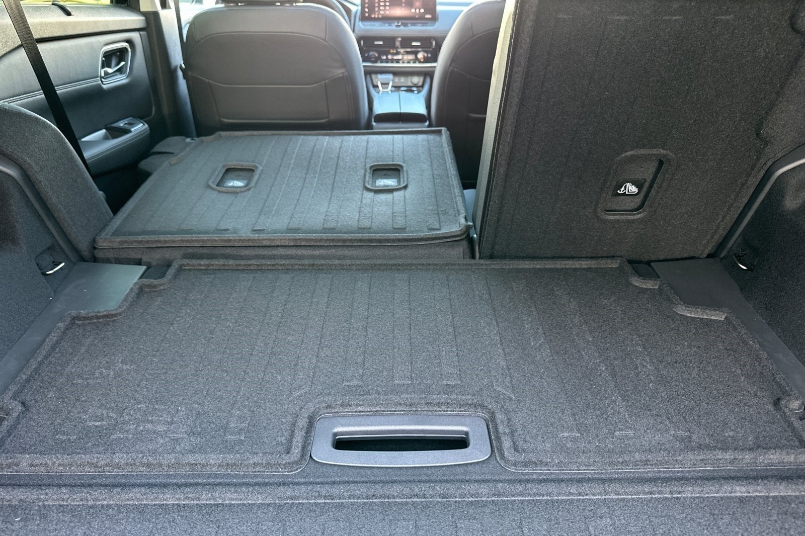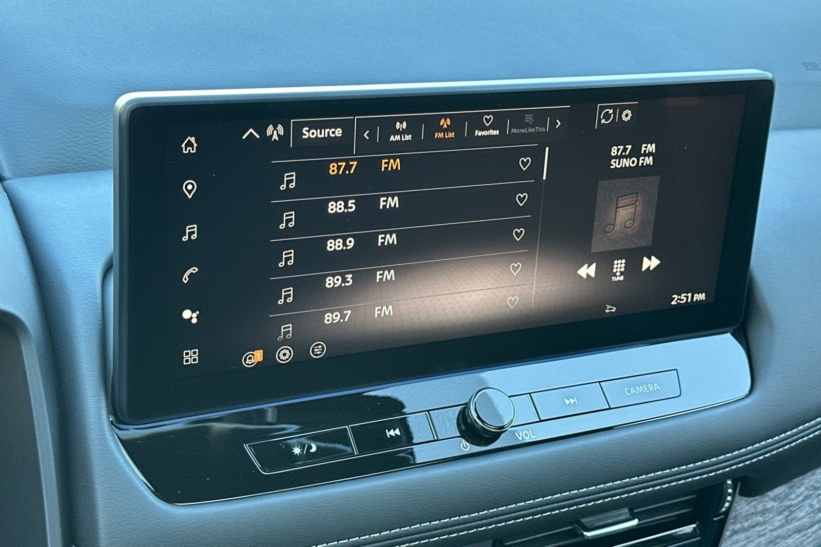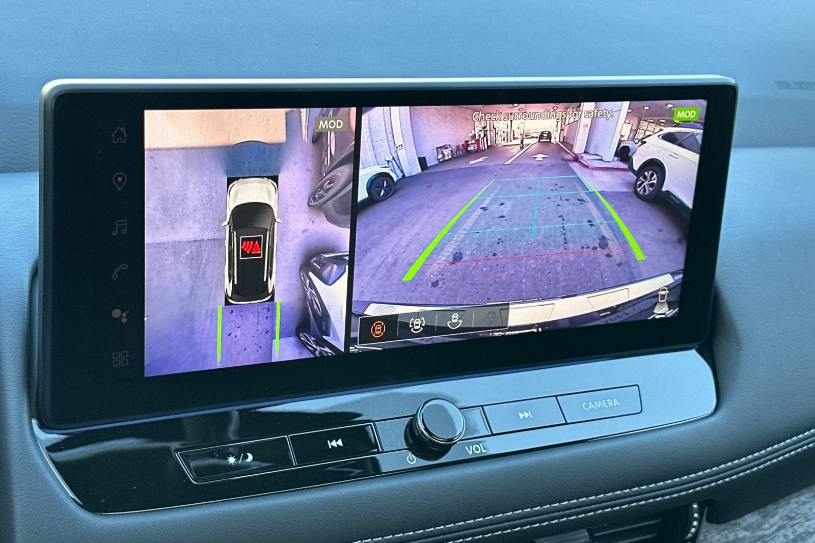 Platinum Premium Package (Head-Up Display, Heated Rear Seats, Motion-Activated Power Liftgate, and Tri-Zone Automatic Temperature Control), Tech Package (3D Enhanced Intelligent Around View Monitor, Driver Attention Warning, ProPILOT Assist 2.1, and Rain-Sensing Wipers), AWD, 10 Speakers, 4-Wheel Disc Brakes, ABS brakes, Air Conditioning, Alloy wheels, AM/FM radio: SiriusXM w/360L, Auto High-beam Headlights, Auto-dimming Rear-View mirror, Automatic temperature control, Black Splash Guards (set of 4), Bose Premium Audio System, Brake assist, Bumpers: body-color, Chrome Rear Bumper Protector, Delay-off headlights, Driver door bin, Driver vanity mirror, Dual front impact airbags, Dual front side impact airbags, Electronic Stability Control, Emergency communication system: NissanConnect Services, Floor Mats with 2-Piece Cargo Area Protector, Four wheel independent suspension, Front anti-roll bar, Front Bucket Seats, Front Center Armrest, Front dual zone A/C, Front reading lights, Fully automatic headlights, Garage door transmitter: myQ Connected Garage, Heads-Up Display, Heated door mirrors, Heated Front Bucket Seats, Heated front seats, Heated steering wheel, Illuminated entry, Illuminated Kick Plates, Knee airbag, Low tire pressure warning, Memory seat, Navigation system: Google Maps, Occupant sensing airbag, Outside temperature display, Overhead airbag, Overhead console, Panic alarm, Passenger door bin, Passenger vanity mirror, Power door mirrors, Power driver seat, Power Liftgate, Power moonroof, Power passenger seat, Power steering, Power windows, Quilted Semi-Aniline Leather-Appointed Seat Trim, Radio data system, Radio: AM/FM NissanConnect with Navigation, Rear anti-roll bar, Rear reading lights, Rear seat center armrest, Rear side impact airbag, Rear window defroster, Rear window wiper, Remote keyless entry, Security system, Speed control, Speed-sensing steering, Speed-Sensitive Wipers, Split folding rear seat, Spoiler, Steering wheel mounted audio controls, Tachometer, Telescoping steering wheel, Tilt steering wheel, Traction control, Trip computer, Turn signal indicator mirrors, Variably intermittent wipers, Wheels: 19 Unique Dark Painted Aluminum Alloy, and Wireless Apple CarPlay/Wireless Android Auto.