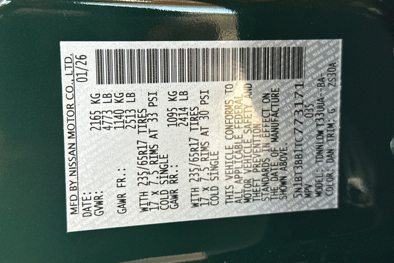AWD, 4-Wheel Disc Brakes, 6 Speakers, ABS brakes, Air Conditioning, Alloy wheels, AM/FM radio, Apple CarPlay/Android Auto, Auto High-beam Headlights, Automatic temperature control, Black Splash Guards (set of 4), Brake assist, Delay-off headlights, Driver door bin, Driver vanity mirror, Dual front impact airbags, Dual front side impact airbags, Electronic Stability Control, Emergency communication system: NissanConnect Services, Four wheel independent suspension, Front anti-roll bar, Front Bucket Seats, Front Center Armrest, Front dual zone A/C, Front reading lights, Fully automatic headlights, Heated door mirrors, Heated Front Bucket Seats, Heated front seats, Illuminated entry, Knee airbag, Leatherette and Ballistic Nylon Seating, Low tire pressure warning, Occupant sensing airbag, Outside temperature display, Overhead airbag, Overhead console, Panic alarm, Passenger door bin, Passenger vanity mirror, Power door mirrors, Power driver seat, Power Liftgate, Power steering, Power windows, Premium Paint, Radio data system, Radio: AM/FM NissanConnect, Rear anti-roll bar, Rear Parking Sensors, Rear seat center armrest, Rear side impact airbag, Rear window defroster, Rear window wiper, Remote keyless entry, Roof rack, Speed control, Speed-sensing steering, Speed-Sensitive Wipers, Split folding rear seat, Spoiler, Steering wheel mounted audio controls, Tachometer, Telescoping steering wheel, Tilt steering wheel, Traction control, Trip computer, USB Charging Cable Set, Variably intermittent wipers, and Wheels: 17 Dark Painted Alloy.