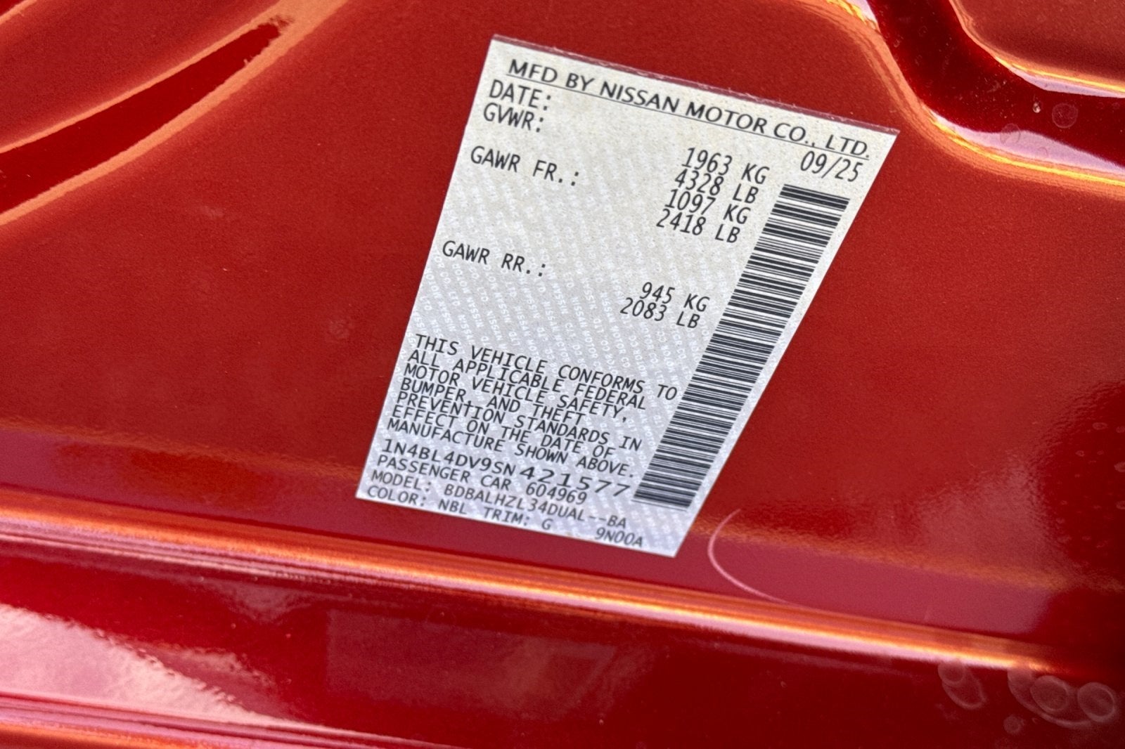 SV Special Edition Package (Body-Color Outside Mirrors, Carbon Fiber Look Center Console Finisher, Dual Zone Automatic HVAC, NissanConnect, Rear Spoiler (Accessory Part), Remote Engine Start w/Intelligent Climate Control, Single Panel Moonroof, Visible Rear Exhaust w/Finisher, and Wheels: 17 Gloss Black Alloy), CVT with Xtronic, 17 Machined Alloy Wheels, 4-Wheel Disc Brakes, 6 Speakers, ABS brakes, Air Conditioning, Alloy wheels, AM/FM radio: SiriusXM, Auto High-beam Headlights, Blind Spot Warning, Body-Colored Splash Guards, Brake assist, Bumpers: body-color, Cloth Seat Trim, Delay-off headlights, Driver door bin, Driver vanity mirror, Dual front impact airbags, Dual front side impact airbags, Electronic Stability Control, Floor Mats/Trunk Mat/Hideaway Net, Four wheel independent suspension, Front anti-roll bar, Front Bucket Seats, Front Center Armrest, Front reading lights, Fully automatic headlights, Illuminated entry, Knee airbag, Low tire pressure warning, NissanConnect featuring Apple CarPlay and Android Auto, Occupant sensing airbag, Outside temperature display, Overhead airbag, Overhead console, Panic alarm, Passenger door bin, Passenger vanity mirror, Power door mirrors, Power driver seat, Power steering, Power windows, Premium Paint, Radio data system, Radio: AM/FM Audio System, Rear anti-roll bar, Rear Parking Sensors, Rear reading lights, Rear seat center armrest, Rear side impact airbag, Rear window defroster, Remote keyless entry, Security system, Speed control, Speed-sensing steering, Speed-Sensitive Wipers, Split folding rear seat, Steering wheel mounted audio controls, Tachometer, Telescoping steering wheel, Tilt steering wheel, Traction control, Trip computer, Trunk Organizer Tray, and Variably intermittent wipers.