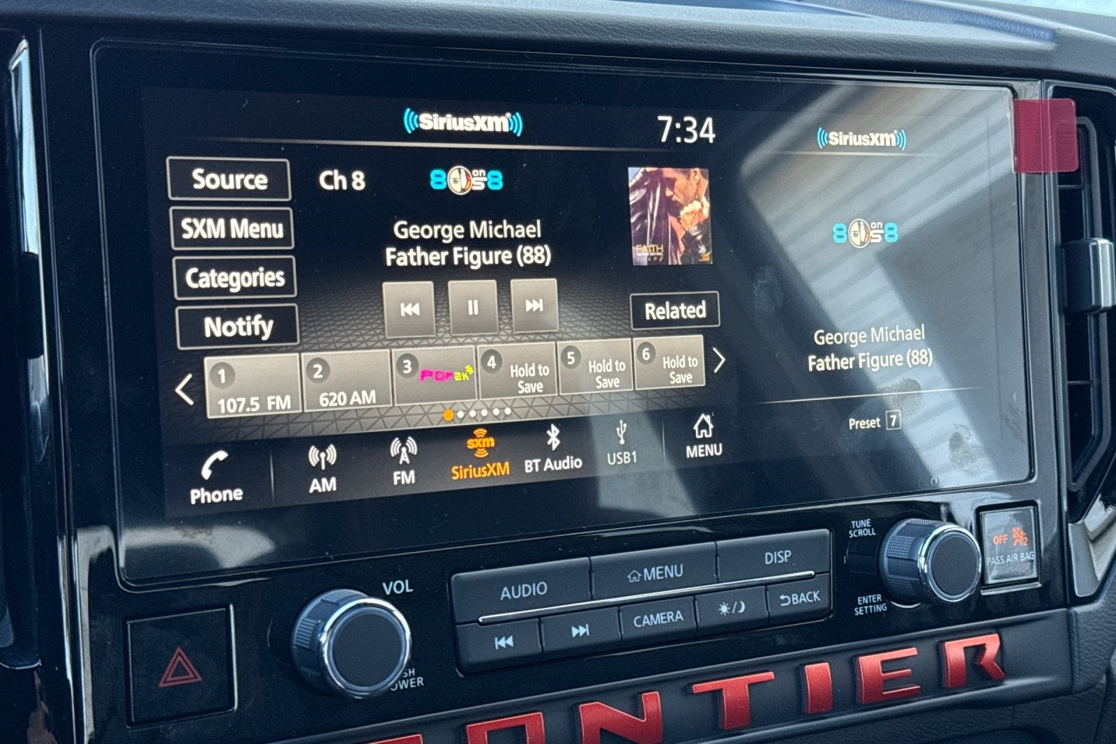 Tow Package, 4WD, 17 Painted Alloy Wheels, 3.692 Axle Ratio, 4-Wheel Disc Brakes, 6 Speakers, ABS brakes, Air Conditioning, Alloy wheels, AM/FM radio: SiriusXM, Anti-whiplash front head restraints, Auto High-beam Headlights, Automatic temperature control, Blind Spot Warning, Brake assist, Bumpers: body-color, Delay-off headlights, Driver door bin, Driver vanity mirror, Drop-In Bed Liner & Bumper Step, Dual front impact airbags, Dual front side impact airbags, Electronic Stability Control, Emergency communication system, Essentials Kit, Front anti-roll bar, Front Bucket Seats, Front Center Armrest, Front dual zone A/C, Front fog lights, Front reading lights, Front wheel independent suspension, Fully automatic headlights, Heated Front Bucket Seats, Heated front seats, Heated steering wheel, Illuminated entry, Knee airbag, Leather steering wheel, Low tire pressure warning, Mud Flaps, Occupant sensing airbag, Off-Road Style Step Rails, Overhead airbag, Overhead console, Panic alarm, Passenger door bin, Passenger vanity mirror, Power door mirrors, Power driver seat, Power passenger seat, Power steering, Power windows, PRO Embroidered Premium Cloth Seat Trim, PRO-4X Carpeted Floor Mats, Radio data system, Radio: SXM/AM/FM/AUX/USB Audio System, Rear anti-roll bar, Rear seat center armrest, Rear side impact airbag, Rear step bumper, Remote keyless entry, Security system, Speed control, Speed-sensing steering, Split folding rear seat, Steering wheel mounted audio controls, Tachometer, Telescoping steering wheel, Tilt steering wheel, Traction control, Trip computer, Variably intermittent wipers, Voltmeter, and Wireless Apple CarPlay/Wireless Android Auto.