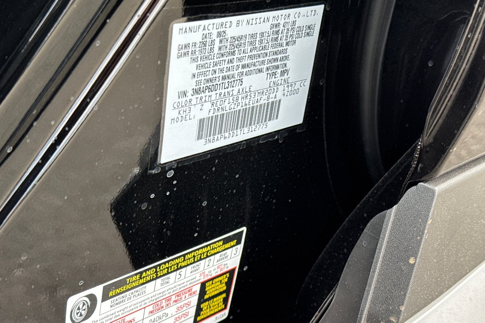 Cold Weather Package (Heated Front Seats, Heated Mirrors, and Rear Floor Heater Ducts), SR Premium Package (Bose 10 -Speaker Audio, Driver Seat-Mounted Supplemental Air Bag, Heated Steering Wheel, and Panoramic Moonroof), 17 Alloy Wheels, 4-Wheel Disc Brakes, 6 Speakers, ABS brakes, Air Conditioning, Alloy wheels, AM/FM radio, Auto High-beam Headlights, Automatic temperature control, Brake assist, Bumpers: body-color, Carpeted Floor Mats, Crossbars, Delay-off headlights, Driver door bin, Driver vanity mirror, Dual front impact airbags, Dual front side impact airbags, Electronic Stability Control, Emergency communication system: NissanConnect Services, Exterior Parking Camera Rear, Four wheel independent suspension, Front anti-roll bar, Front Bucket Seats, Front Center Armrest, Front reading lights, Fully automatic headlights, Garage door transmitter: myQ Connected Garage, Illuminated entry, Knee airbag, Leather Shift Knob, Leather steering wheel, Low tire pressure warning, NissanConnect featuring Apple CarPlay and Android Auto, Occupant sensing airbag, Outside temperature display, Overhead airbag, Overhead console, Panic alarm, Passenger door bin, Passenger vanity mirror, Power door mirrors, Power steering, Power windows, Radio data system, Radio: AM/FM/SiriusXM Audio System, Rear anti-roll bar, Rear reading lights, Rear seat center armrest, Rear side impact airbag, Rear window defroster, Rear window wiper, Remote keyless entry, Security system, Speed control, Speed-sensing steering, Splash Guards, Split folding rear seat, Spoiler, Sport Leatherette w/Cloth Insert Seat Trim, Sport steering wheel, Steering wheel mounted audio controls, Tachometer, Telescoping steering wheel, Tilt steering wheel, Traction control, Trip computer, Turn signal indicator mirrors, Variably intermittent wipers, and Wheels: 19 Dark Gray Alloy.