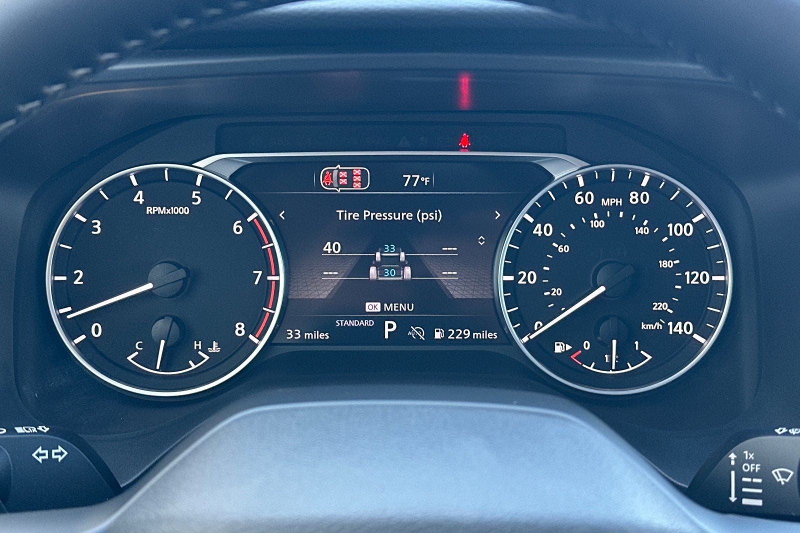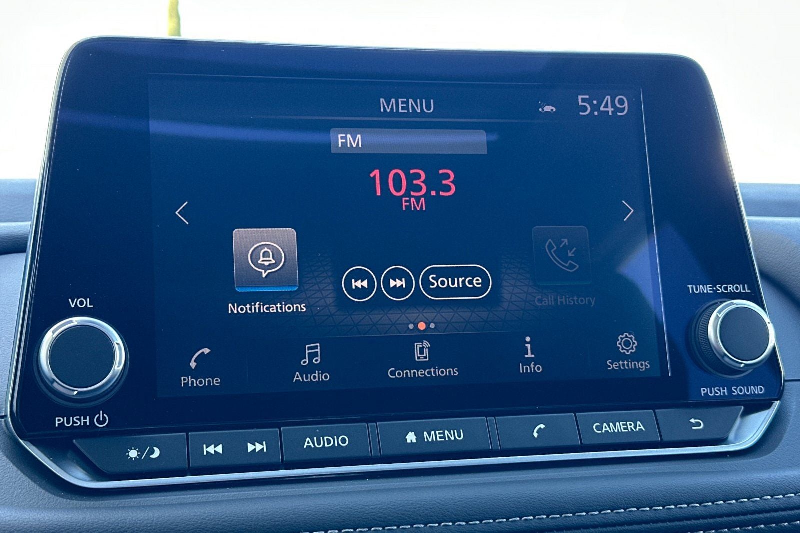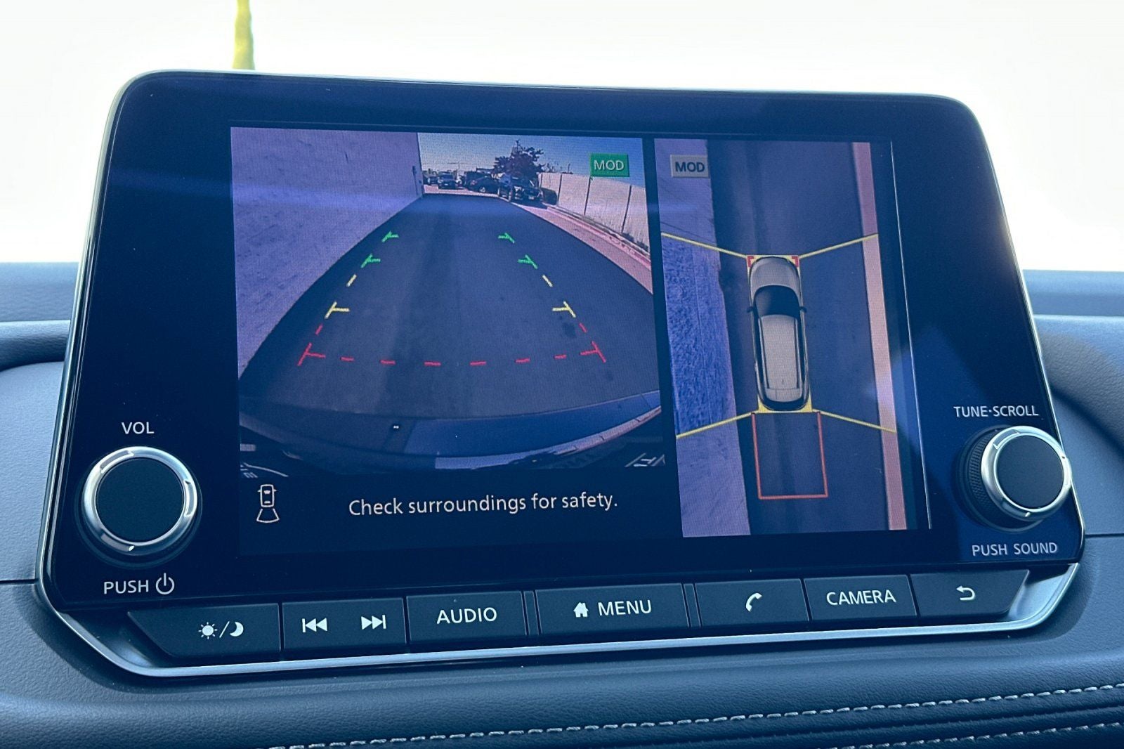 4-Wheel Disc Brakes, 6 Speakers, ABS brakes, Air Conditioning, Alloy wheels, AM/FM radio, Apple CarPlay/Android Auto, Auto High-beam Headlights, Automatic temperature control, Black Splash Guards (set of 4), Brake assist, Bumpers: body-color, Delay-off headlights, Driver door bin, Driver vanity mirror, Dual front impact airbags, Dual front side impact airbags, Electronic Stability Control, Emergency communication system: NissanConnect Services, Exterior Parking Camera Rear, First Aid Kit, Floor Mats with 1-Piece Cargo Area Protector, Four wheel independent suspension, Frameless Rearview Mirror with Universal Remote, Front anti-roll bar, Front Bucket Seats, Front Center Armrest, Front dual zone A/C, Front reading lights, Fully automatic headlights, Heated door mirrors, Heated Front Bucket Seats, Heated front seats, Heated steering wheel, Illuminated entry, Illuminated Kick Plates, Knee airbag, Low tire pressure warning, Occupant sensing airbag, Outside temperature display, Overhead airbag, Overhead console, Panic alarm, Passenger door bin, Passenger vanity mirror, Power door mirrors, Power driver seat, Power Liftgate, Power moonroof, Power steering, Power windows, Prima-Tex Leatherette Seat Trim, Radio data system, Radio: AM/FM NissanConnect, Rear anti-roll bar, Rear Parking Sensors, Rear reading lights, Rear seat center armrest, Rear side impact airbag, Rear window defroster, Rear window wiper, Remote keyless entry, Retractable Cargo Cover, Speed control, Speed-sensing steering, Speed-Sensitive Wipers, Split folding rear seat, Spoiler, Steering wheel mounted audio controls, Tachometer, Telescoping steering wheel, Tilt steering wheel, Traction control, Trip computer, Variably intermittent wipers, and Wheels: 19 Black Painted and Machine Finished Alloy.