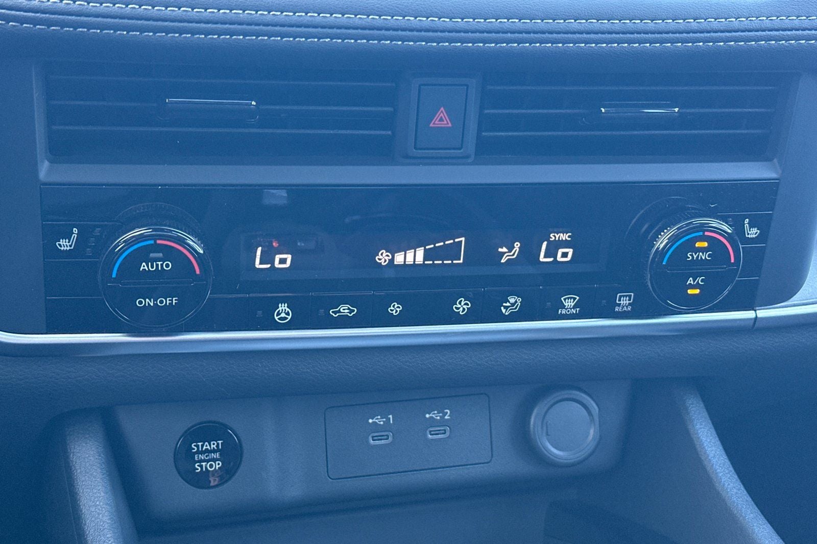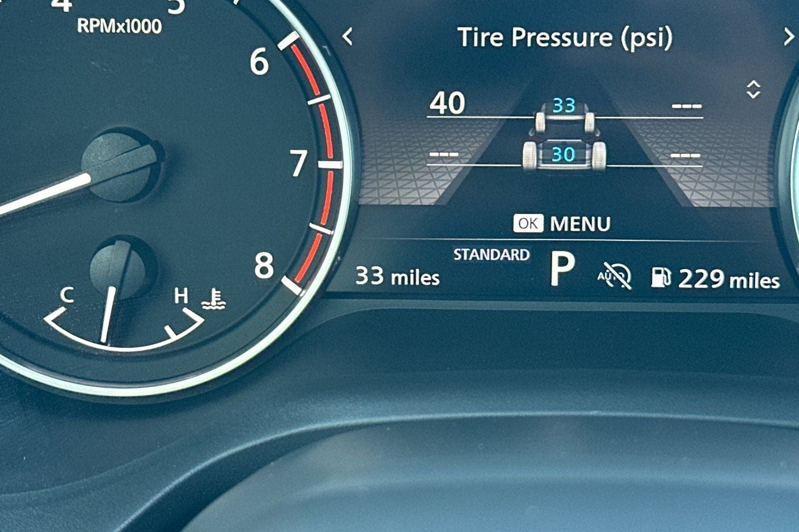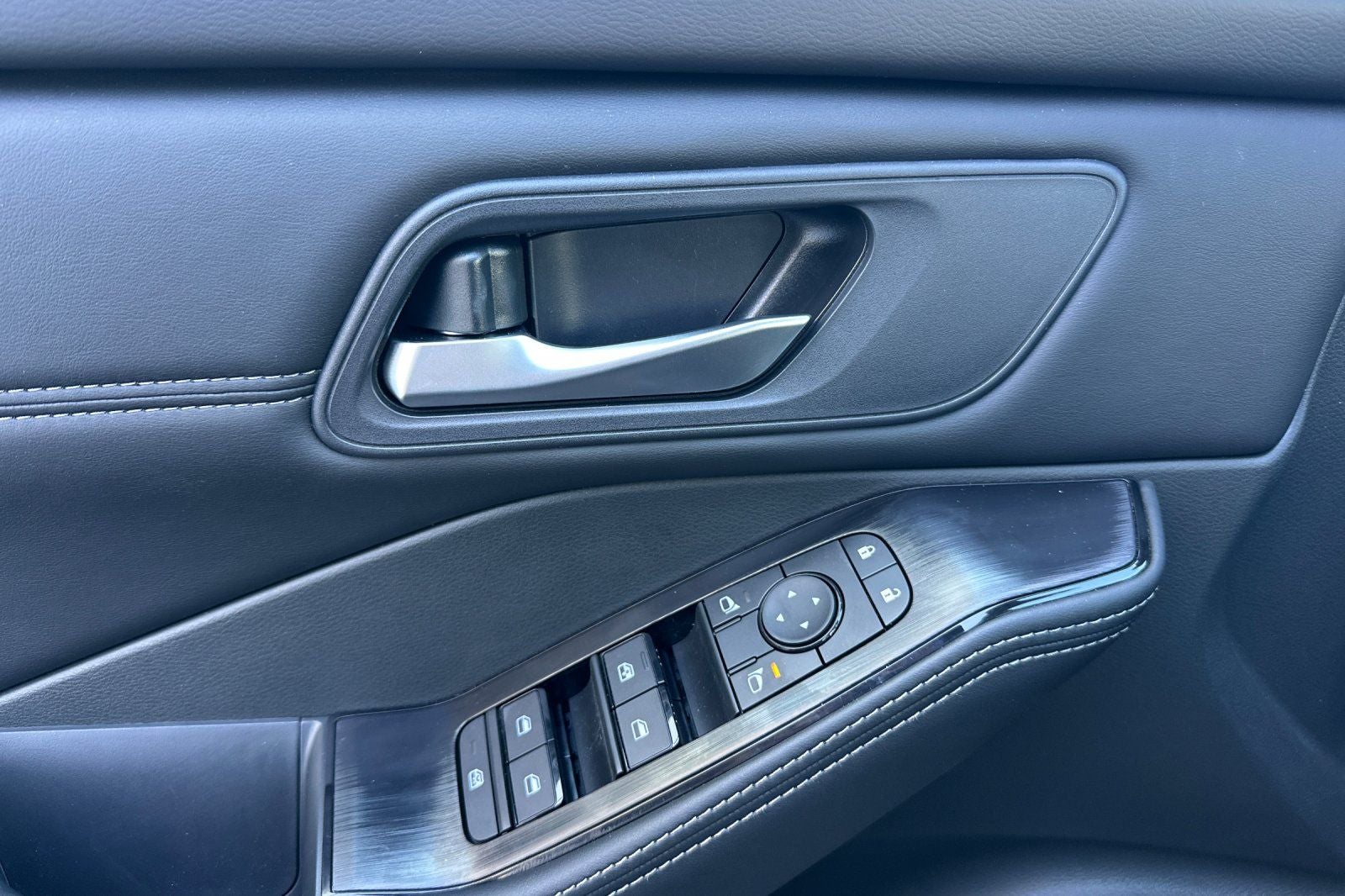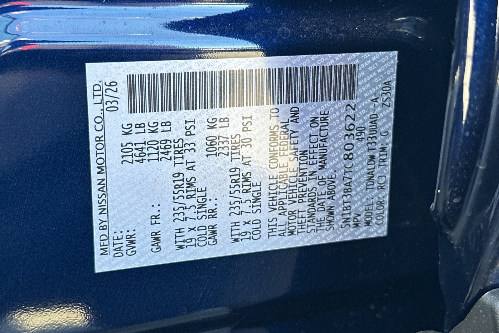 4-Wheel Disc Brakes, 6 Speakers, ABS brakes, Air Conditioning, Alloy wheels, AM/FM radio, Apple CarPlay/Android Auto, Auto High-beam Headlights, Automatic temperature control, Black Splash Guards (set of 4), Brake assist, Bumpers: body-color, Delay-off headlights, Driver door bin, Driver vanity mirror, Dual front impact airbags, Dual front side impact airbags, Electronic Stability Control, Emergency communication system: NissanConnect Services, Exterior Parking Camera Rear, First Aid Kit, Floor Mats with 1-Piece Cargo Area Protector, Four wheel independent suspension, Frameless Rearview Mirror with Universal Remote, Front anti-roll bar, Front Bucket Seats, Front Center Armrest, Front dual zone A/C, Front reading lights, Fully automatic headlights, Heated door mirrors, Heated Front Bucket Seats, Heated front seats, Heated steering wheel, Illuminated entry, Illuminated Kick Plates, Knee airbag, Low tire pressure warning, Occupant sensing airbag, Outside temperature display, Overhead airbag, Overhead console, Panic alarm, Passenger door bin, Passenger vanity mirror, Power door mirrors, Power driver seat, Power Liftgate, Power moonroof, Power steering, Power windows, Prima-Tex Leatherette Seat Trim, Radio data system, Radio: AM/FM NissanConnect, Rear anti-roll bar, Rear Parking Sensors, Rear reading lights, Rear seat center armrest, Rear side impact airbag, Rear window defroster, Rear window wiper, Remote keyless entry, Retractable Cargo Cover, Speed control, Speed-sensing steering, Speed-Sensitive Wipers, Split folding rear seat, Spoiler, Steering wheel mounted audio controls, Tachometer, Telescoping steering wheel, Tilt steering wheel, Traction control, Trip computer, Variably intermittent wipers, and Wheels: 19 Black Painted and Machine Finished Alloy.