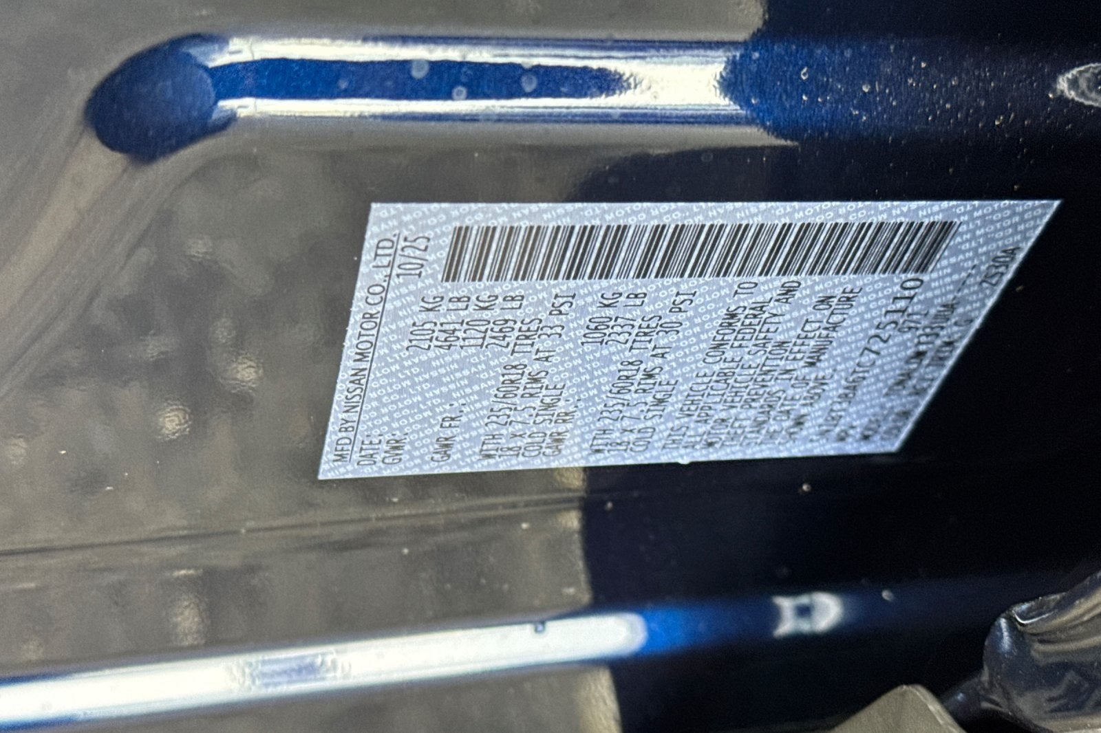 4-Wheel Disc Brakes, 6 Speakers, ABS brakes, Air Conditioning, Alloy wheels, AM/FM radio: Sirius, Apple CarPlay/Android Auto, Auto High-beam Headlights, Automatic temperature control, Black Splash Guards (Set of 4) (B92), Brake assist, Bumpers: body-color, Chrome Rear Bumper Protector, Delay-off headlights, Driver door bin, Driver vanity mirror, Dual front impact airbags, Dual front side impact airbags, Electronic Stability Control, Emergency communication system: NissanConnect Services, First Aid Kit, Floor Mats w/1-Piece Cargo Area Protector, Four wheel independent suspension, Front anti-roll bar, Front Bucket Seats, Front Center Armrest, Front dual zone A/C, Front reading lights, Fully automatic headlights, Heated door mirrors, Illuminated entry, Knee airbag, Low tire pressure warning, Occupant sensing airbag, Outside temperature display, Overhead airbag, Overhead console, Panic alarm, Passenger door bin, Passenger vanity mirror, Power door mirrors, Power driver seat, Power Liftgate, Power steering, Power windows, Prima-Tex Leatherette Seat Trim, Radio data system, Radio: AM/FM NissanConnect, Rear anti-roll bar, Rear seat center armrest, Rear side impact airbag, Rear window defroster, Rear window wiper, Remote keyless entry, Retractable Cargo Cover, Speed control, Speed-sensing steering, Speed-Sensitive Wipers, Split folding rear seat, Spoiler, Steering wheel mounted audio controls, Tachometer, Telescoping steering wheel, Tilt steering wheel, Traction control, Trip computer, USB Charging Cable Set, and Variably intermittent wipers.