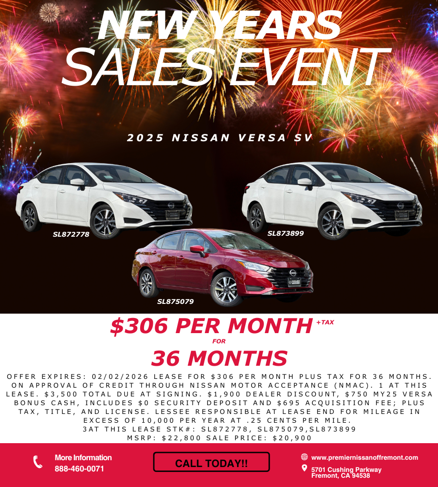 OFFER EXPIRES: 02/02/2026 LEASE FOR $306 PER MONTH PLUS TAX FOR 36 MONTHS. ON APPROVAL OF CREDIT THROUGH NISSAN MOTOR ACCEPTANCE (NMAC). 1 AT THIS LEASE. $3,500 TOTAL DUE AT SIGNING. $1,900 DEALER DISCOUNT, $750 MY25 VERSA BONUS CASH, INCLUDES $0 SECURITY DEPOSIT AND $695 ACQUISITION FEE; PLUS TAX, TITLE, AND LICENSE. LESSEE RESPONSIBLE AT LEASE END FOR MILEAGE IN EXCESS OF 10,000 PER YEAR AT .25 CENTS PER MILE. 3 AT THIS LEASE STK#: SL872778,SL875079,SL873899 MSRP: $22,800 SALE PRICE: $20,900