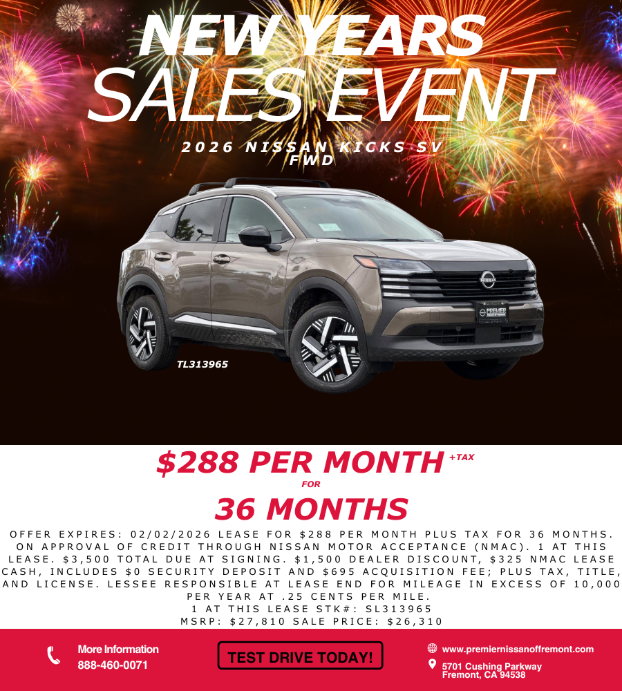 OFFER EXPIRES: 02/02/2026 LEASE FOR $288 PER MONTH PLUS TAX FOR 36 MONTHS. ON APPROVAL OF CREDIT THROUGH NISSAN MOTOR ACCEPTANCE (NMAC). 1 AT THIS LEASE. $3,500 TOTAL DUE AT SIGNING. $1,500 DEALER DISCOUNT, $325 NMAC LEASE CASH, INCLUDES $0 SECURITY DEPOSIT AND $695 ACQUISITION FEE; PLUS TAX, TITLE, AND LICENSE. LESSEE RESPONSIBLE AT LEASE END FOR MILEAGE IN EXCESS OF 10,000 PER YEAR AT .25 CENTS PER MILE. 1 AT THIS LEASE STK#: SL313965 MSRP: $27,810 SALE PRICE: $26,310