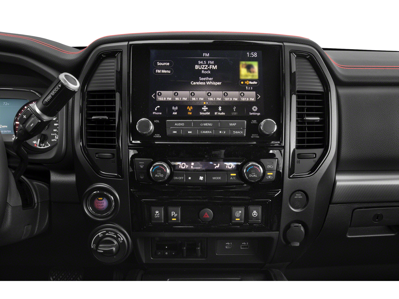 PRO-4X Convenience Package (4-Way Power Assist Seat, Heated Driver & Passenger Seat, Heated Power Tilt/Telescopic Steering Wheel, Heated Rear Seats, Intelligent Around View Monitor (I-AVM), Leather Seat Trim, Memory Driver Seat w/Auto Entry/Exit Feature, Power Folding Auto Dimming Outside Mirrors, and Side Turn Signal Lamps on Mirror Housing), PRO-4X Utility Package (Fender Premium Audio System w/12 Speakers and Proximity Activation), 4WD, 3.692 Axle Ratio, 4-Wheel Disc Brakes, 6 Speakers, ABS brakes, Air Conditioning, Alloy wheels, AM/FM radio: SiriusXM, Auto High-beam Headlights, Auto-dimming Rear-View mirror, Auto-leveling suspension, Automatic temperature control, Bed Assist Grip, Black Tow Mirror Kit (T93), Blind Spot Warning, Brake assist, Cloth Seat Trim w/Vinyl Bolsters, Compass, Delay-off headlights, Driver door bin, Driver vanity mirror, Dual front impact airbags, Dual front side impact airbags, Electronic Stability Control, Emergency communication system: NissanConnect Services, Front anti-roll bar, Front Bucket Seats, Front Captain's Seats, Front Center Armrest, Front dual zone A/C, Front fog lights, Front reading lights, Front wheel independent suspension, Fully automatic headlights, Garage door transmitter: HomeLink, Heated door mirrors, Illuminated entry, Knee airbag, Leather steering wheel, Low tire pressure warning, Navigation system: NissanConnect Navigation, NissanConnect featuring Apple CarPlay and Android Auto, Occupant sensing airbag, Outside temperature display, Overhead airbag, Overhead console, Panic alarm, Passenger door bin, Passenger vanity mirror, Power door mirrors, Power driver seat, Power steering, Power windows, PRO-4X Badged Floor Mats (DISC), Pro4X Mud Flaps, Pro4X Rugged Step Boards, Radio data system, Radio: NissanConnect w/Navigation, Rain sensing wipers, Rear anti-roll bar, Rear Bumper Step w/Electronic Tailgate Lock, Rear Parking Sensors, Rear seat center armrest, Rear step bumper, Rear window defroster, Remote keyless entry, Security system, Speed control, Speed-sensing steering, Speed-Sensitive Wipers, Split folding rear seat, Steering wheel mounted audio controls, Tachometer, Telescoping steering wheel, Tilt steering wheel, Traction control, Trip computer, Variably intermittent wipers, Voltmeter, and Wheels: 18 x 8 Painted Dark Finish Alloy. 4WD.