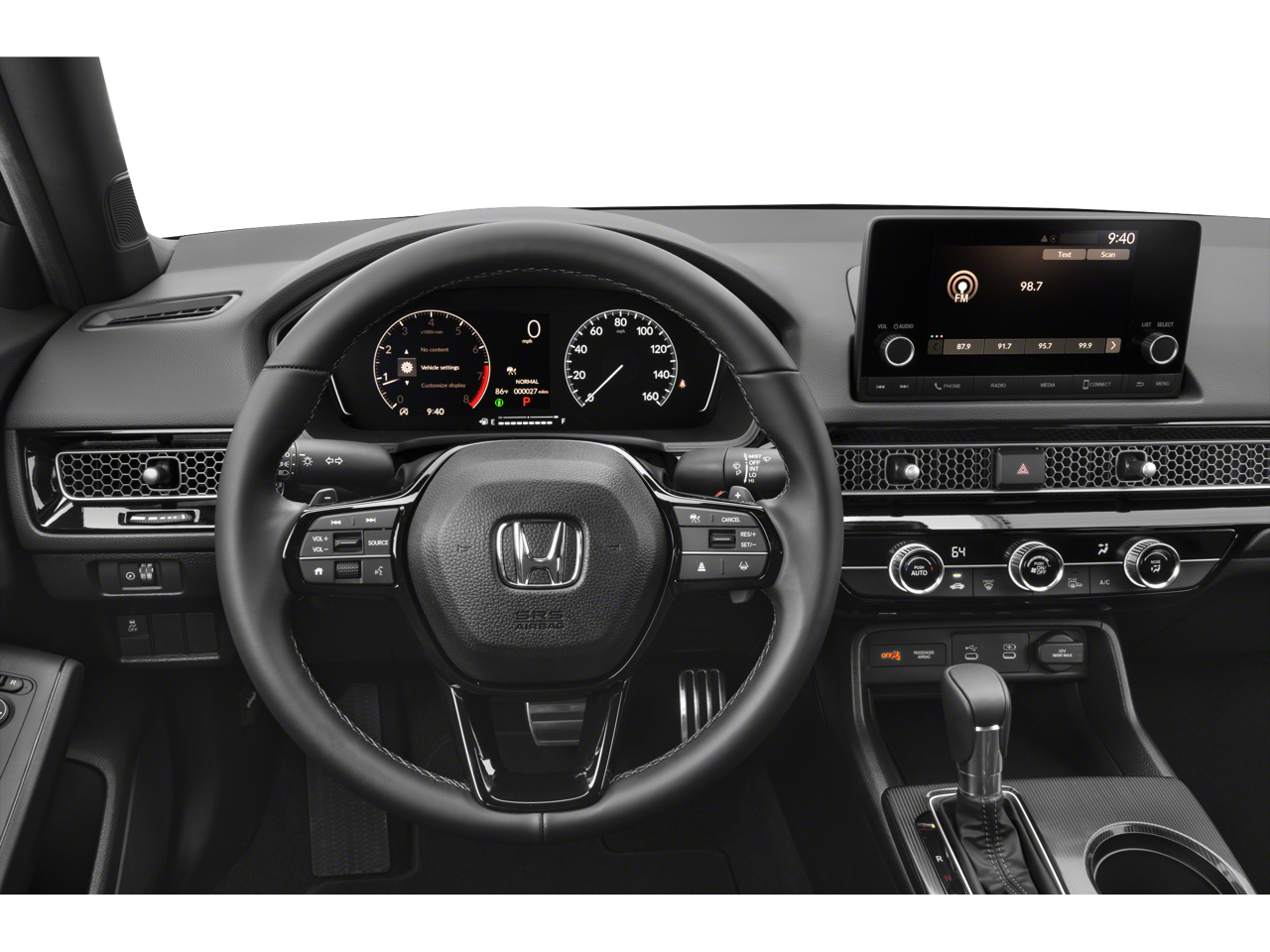 4-Wheel Disc Brakes, 8 Speakers, ABS brakes, Adaptive Cruise Control: Adaptive Cruise Control (ACC) with Low-Speed Follow, Air Conditioning, Alloy wheels, AM/FM radio, Apple CarPlay/Android Auto, Auto High-beam Headlights, Automatic temperature control, Blind Spot Information (BSI) System warning, Brake assist, Bumpers: body-color, Cloth/Leatherette Seating Surfaces, Delay-off headlights, Driver door bin, Driver vanity mirror, Dual front impact airbags, Dual front side impact airbags, Electronic Stability Control, Emergency communication system: HondaLink, Exterior Parking Camera Rear, Four wheel independent suspension, Front anti-roll bar, Front Bucket Seats, Front Center Armrest, Front reading lights, Fully automatic headlights, Heated door mirrors, Illuminated entry, Knee airbag, Leather Shift Knob, Leather steering wheel, Low tire pressure warning, Occupant sensing airbag, Outside temperature display, Overhead airbag, Panic alarm, Passenger door bin, Passenger vanity mirror, Power door mirrors, Power steering, Power windows, Radio data system, Radio: 180-Watt Audio System, Rear anti-roll bar, Rear seat center armrest, Rear side impact airbag, Rear window defroster, Remote keyless entry, Security system, Speed control, Speed-sensing steering, Split folding rear seat, Steering wheel mounted audio controls, Tachometer, Telescoping steering wheel, Tilt steering wheel, Traction control, Trip computer, and Wheels: 18 Gloss Black Alloy.