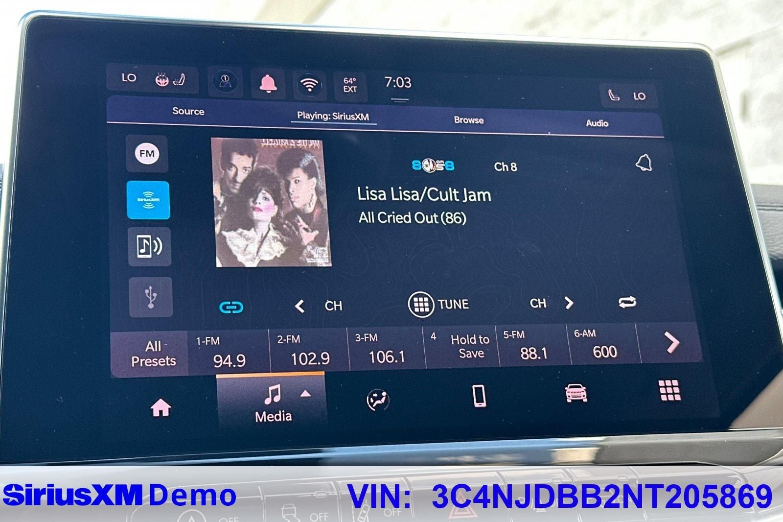 - UConnect 5 w/Seek-Scan, Clock, Aux Audio Input Jack, Steering Wheel Controls and Voice Activation